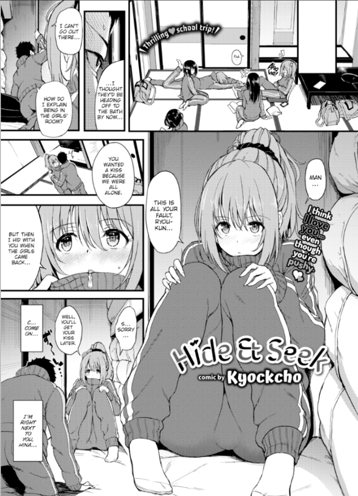 Kakurenbo es una historia del artista Kyockcho que salió a la venta en la revista Comic Bavel en su edición de junio del 2018. Después de su lanzamiento, FAKKU! puso a la venta una versión traducida al ingles titulada Hide & Seek. El manga gira en torno a Ryou y Hina, una pareja de estudiantes que lleva seis meses saliendo, pero que aún no ha compartido momentos típicos de novios. Durante un viaje escolar, Ryou, incapaz de contenerse más, decide colarse en la habitación de las chicas para besar a Hina. Justo cuando está a punto de lograrlo, las demás compañeras regresan inesperadamente. Para evitar ser vistos, Ryou y Hina se esconden en el armario, y aunque las otras chicas están muy cerca, la tensión del momento los lleva a dejarse llevar y explorar algo más atrevido en ese espacio reducido.