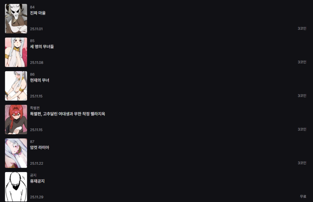 Desde el mes de noviembre se anunció por medio la pagina oficial de Lezhin, que el manhwa +18 «Un mundo sin Hombres» entrará en pausa por motivos de salud del artista. Quedando hasta el capítulo 87 hasta el momento.