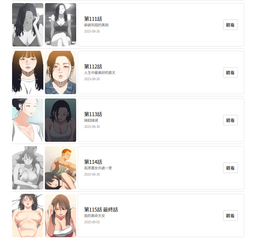 El 2 de septiembre en la página oficial de Toptoon.net publicó el ultimo capítulo de la versión sin censura del Manhwa para adultos «Vacaciones de verano» así completando los 115 capítulos ya emitidos con este formato.